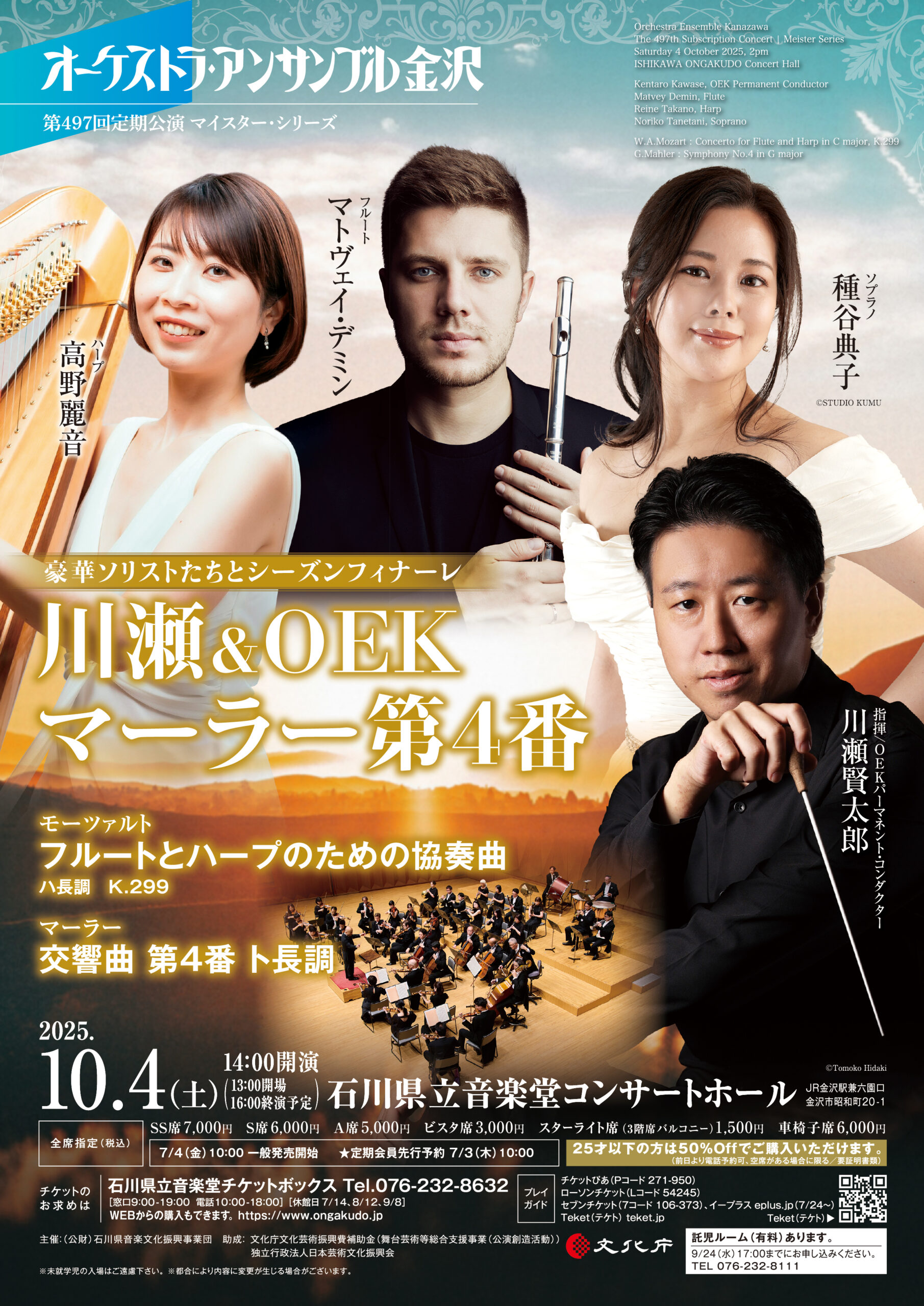 2024/25年のマイスター・シリーズを締め括るステージには、OEKパーマネント・コンダクターの川瀬賢太郎が登場。OEKにとっては初のマーラー作品となる「交響曲第4番」と、モーツァルトの可憐な佳品「フルートとハープのための協奏曲」を披露する。マーラーの最終楽章で登場するソプラノには、種谷典子。モーツァルトでは、フルートのマトヴェイ・デミン、ハープの高野麗音と、今がまさに“旬”の豪華なソリスト陣を迎えて、彩なる響きの世界が紡がれる。