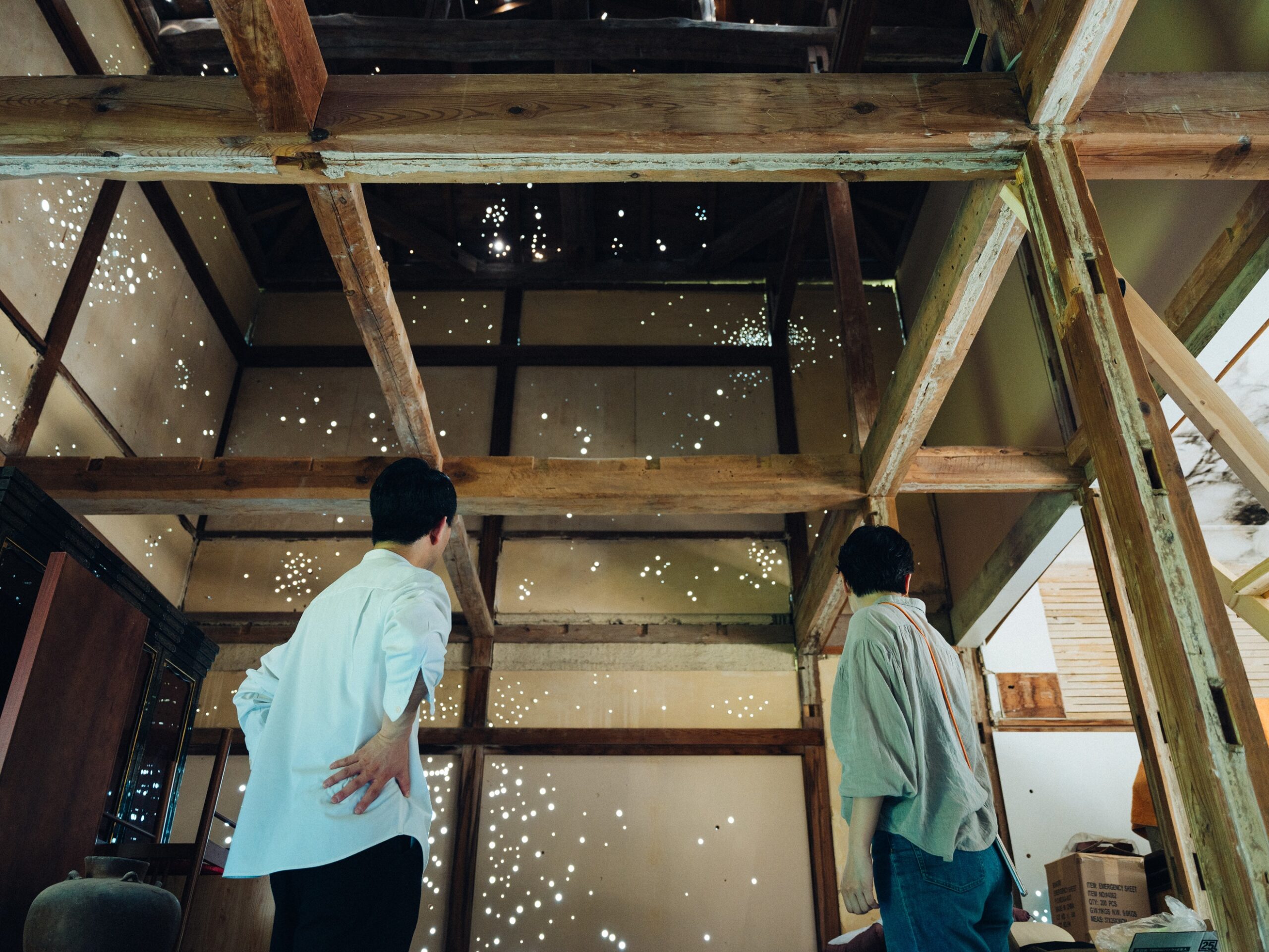 「あかるい家」は、もとは2021年の「奥能登国際芸術祭2020+」に寄せた作品です。珠洲市正院町の珪藻土工場の事務所だった空き家をまるまる使わせていただき、壁面や天井に無数の穴をあけて透明のアクリルを差し込むことで、昼は部屋に太陽の光を取り込み、夜は照明が外へと漏れだします。