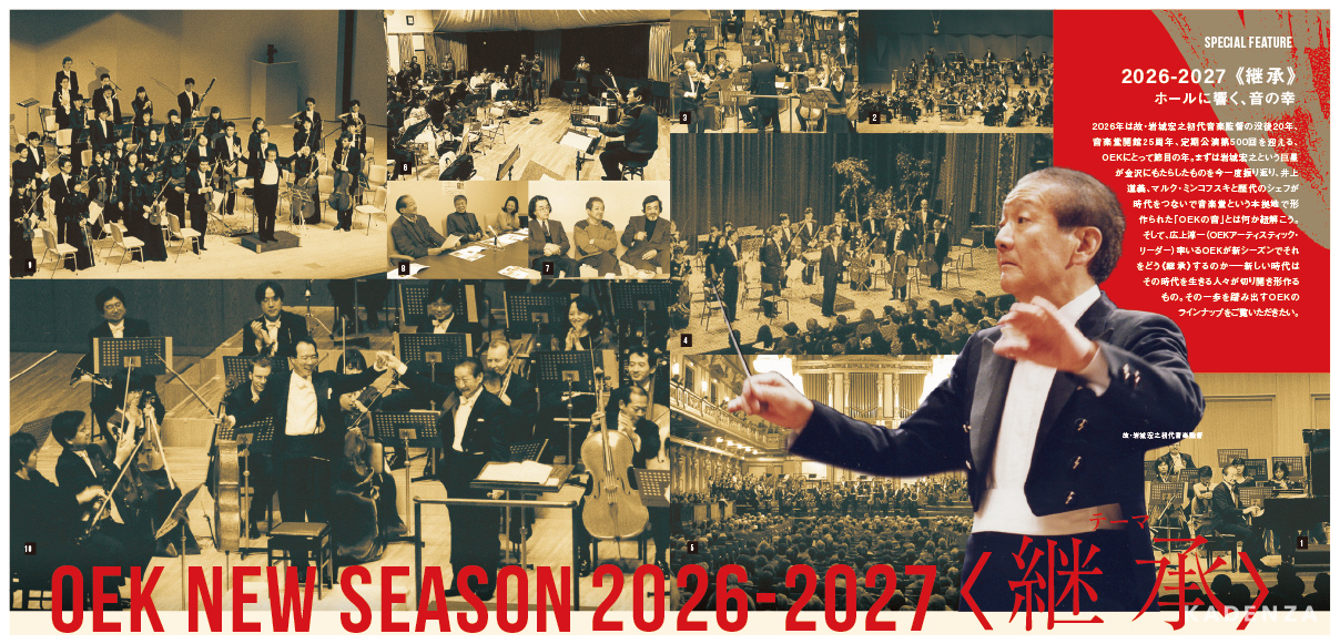 2026年は故・岩城宏之初代音楽監督の没後20年、音楽堂開館2 5周年、定期公演第5 0 0 回を迎える、OEKにとって節目の年。まずは岩城宏之という巨星が金沢にもたらしたものを今一度振り返り、井上道義、マルク・ミンコフスキと歴代のシェフが時代をつないで音楽堂という本拠地で形作られた「OEKの音」とは何か紐解こう。 そして、広上淳一(OEKアーティスティック・リーダー)率いるOEKが新シーズンでそれをどう《継承》するのか―新しい時代はその時代を生きる人々が切り開き形作るもの。その一歩を踏み出すOEKのラインナップをご覧いただきたい。