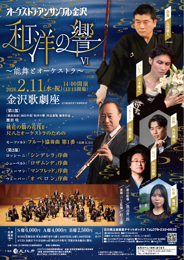 音楽堂では、これまでオーケストラ・アンサンブル金沢(以下、OEK)によって「和」と「洋」の数々のコラボレーション作品が上演されてきたが、「和洋の響」は和楽器が用いられ能舞と合わせることが可能な作品を公募し、さらには能舞とバレエが合わさる斬新かつ意欲的な公演。60年代から武満徹らと能舞とのコラボレーションを実践し、OEKでも積極的に新作を委嘱してきた“現代音楽の初演魔”岩城宏之初代音楽監督の遺志を受け継ぐ重要な場でもある。今回はどんな舞台になるか―まずは作曲された作品がいかなる意図で創られたか、そして他に類を見ない本企画の見どころをお届けしよう。